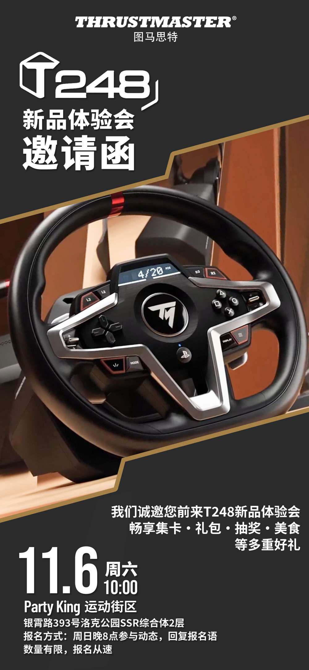 礼品:每人一份价值158元PartyKing单日畅玩、以及价值500元大礼包,另有T248套装、赛车支架、eSwap手柄等多个大奖等你来抽取