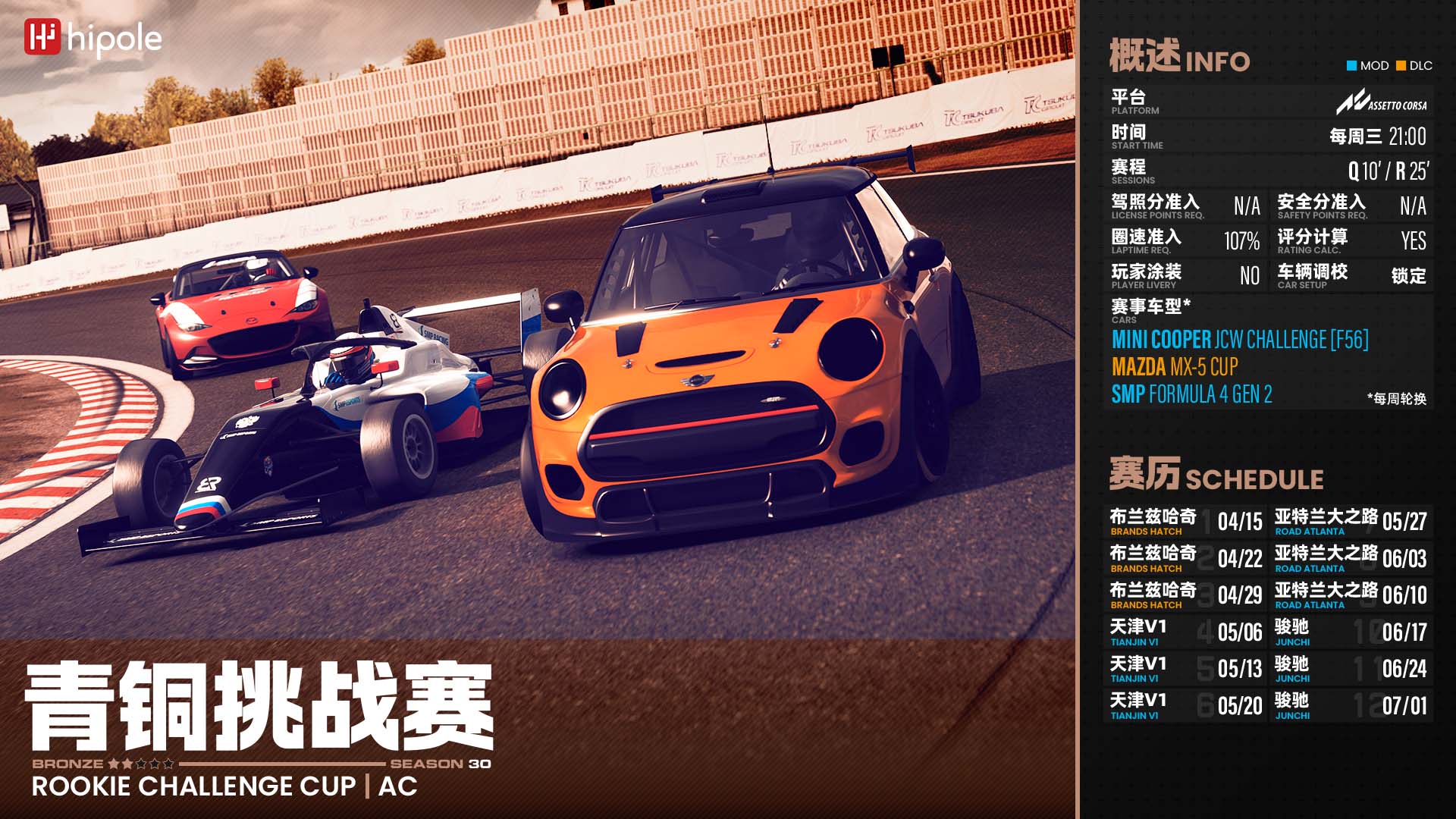 | 模组下载 | 赛季车型 1.HiPole Mini Cooper JCW Challenge (F56):百度网盘(hipo) 2.Mazda MX-5 Cup:DLC Assetto Corsa - Japanese Pack 3.SMP Formula 4 GEN 2:点击下载 |